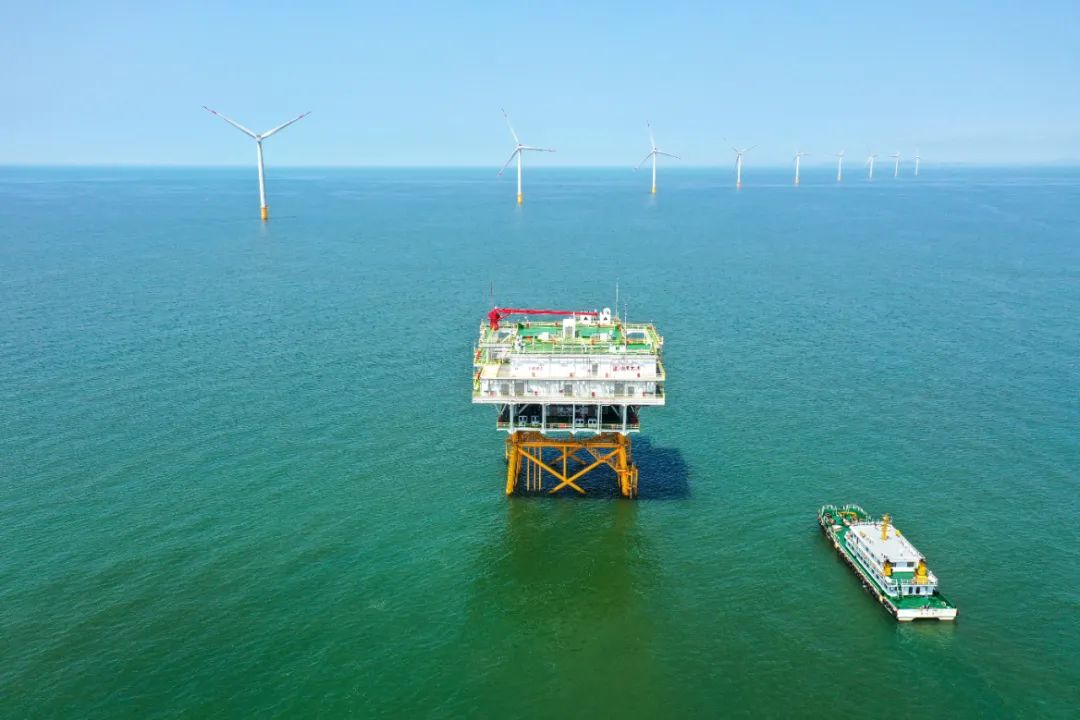 海上升压站整体外形尺寸为40×40×24米,单体重量达2550.7吨,是国内同容量级别重量最轻、设计最先进的升压站,也是全国首个海上220KV全预制舱组块海上风电升压站。实际建造时间139天,运到现场后海上整体吊装一天,焊接安装两天,随后快速进入联调阶段,创造了国内预制式升压站陆上建造最短工期记录。