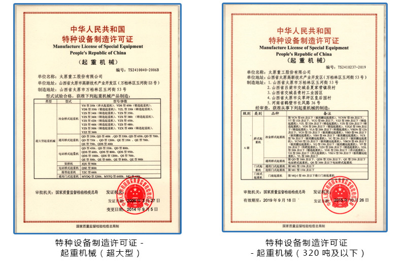 针对起重机、压力容器等特种设备,太重建立特种设备制造、安装、改造、维修质量保证体系,取得特种设备设计、生产制造许可证。